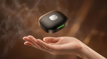 科技感十足的3D重拟物设计,金属与皮革质感融合,光影流动中悬浮于掌心,未来感与精致工艺交织,展现高端智能设备的独特魅力。