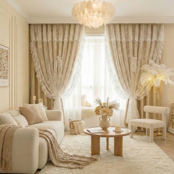 北欧极简风格室内场景,整体以纯白色为基调,搭配温暖的原木色与橙色点缀,明亮通透的空间内,右侧有一个圆形的棕色豆袋沙发,前方地面铺着圆形编织纹理地毯,左侧靠墙设有多层木质搁板,上面摆放着黑色花瓶及干花装饰,背景是带有弧形门洞的白色窗帘,自然光透过窗帘柔和洒入,顶部嵌入式条形灯带与筒灯提供均匀照明,营造出简约、舒适、自然的居家氛围。