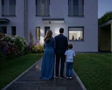 现代风格别墅,位于缓坡之上,整体呈现白色与木质棕色搭配的外立面,大面积落地玻璃窗,内部灯火通明,悬挑式露台设计,周围环绕修剪整齐的绿色草坪、低矮灌木、石阶小径,背景是傍晚时分的淡蓝色天空,远处有模糊的山脉轮廓,光线柔和,营造出宁静而高端的居住氛围。