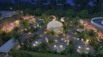 一个位于松林内的温泉泡池,泡池的外轮廓结合从龙爪的元素抽象化设计,泡池相连一个休闲平台,平台上放置有两把休闲躺椅,泡池的压顶齐平平台,泡池周边是自然的石头结合低矮的灌木,平台是龙鳞样式的压纹。温泉的进水口由烛龙元素与大块的石头结合而成,温泉水从进水口流入泡池内,温泉水从烛龙的烛台流入泡池内。烛龙是人面龙身拿着烛台的形象。泡池内禁止溢水出去,平台外是丰富的植物绿化:大乔木、小乔木以及灌木,且局部点缀