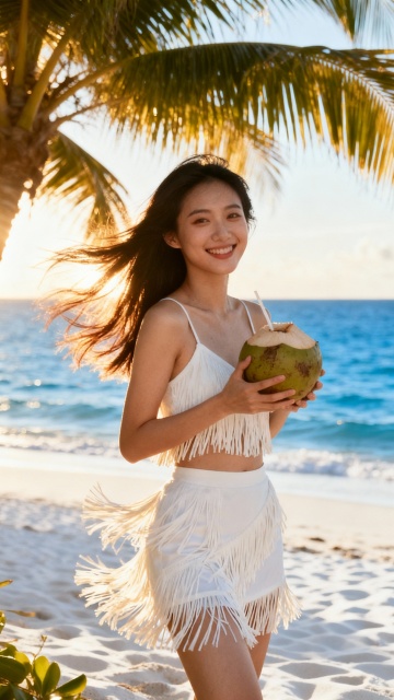 海边清新实景,少女展臂微笑,白色裙装尽显清爽夏日风情。