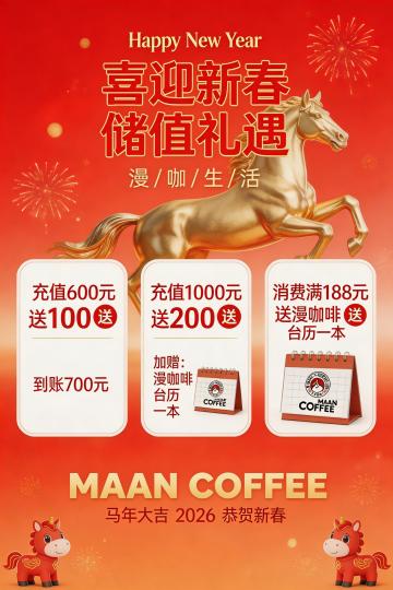 喜庆红金配色,中式浮雕马造型结合鎏金书法,重拟物风呈现国潮质感,烟花祥云点缀,传递马年新春的吉祥氛围。
