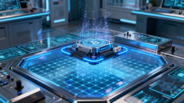 等轴视角的 3D 数字孪生工业场景,画面中心是一台未来感的电脑主机/控制中枢,显示悬浮的 AI 算法代码界面和数据云标识;周围环绕多个象征业务领域的 3D 模块:机械臂+输送平台(代表智能制造)、履带式特种机器人+水池反应堆模块(核电与异物检测)、医疗十字与手术监护界面模块(智慧医疗)、城市建筑+管道检测模块(城市排水识别)、摄像机/传感器模块(AI感知)。所有模块通过发光的数据线连接,构成信息中