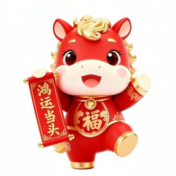 软3D风格萌马拟人形象,身着国潮红衣,手持春联,喜庆卡通感十足,传递新春祝福。