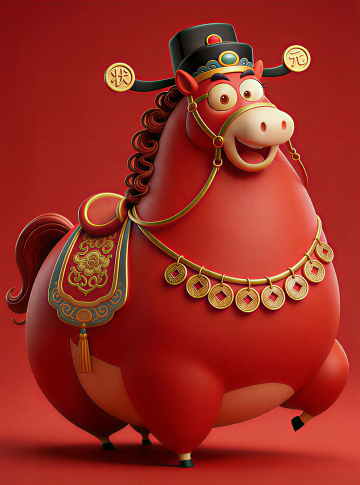 软3D风拟人小马,身着国潮红衣,手抱“福”字钱袋,金币飞舞,喜庆可爱,鎏金质感点缀,节日氛围浓厚。