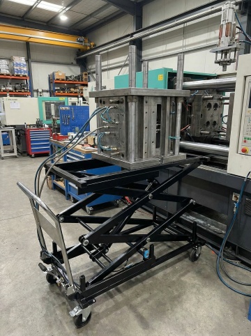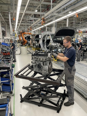 现代化工业场景,蓝色为主色调,清新明亮的光线,干净整洁的生产线,透明玻璃幕墙外是蓝天白云,绿色植物点缀在车间角落,机械臂精准运作,地面反光如镜,整体氛围充满科技感与希望