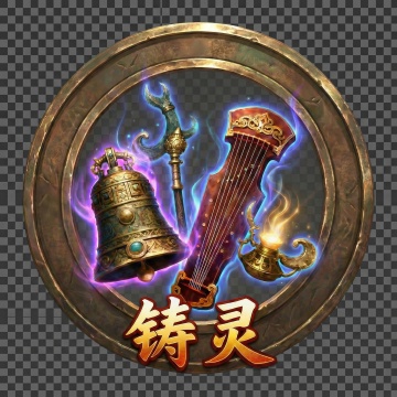 复古感与古典感交织,金属风与浮雕风结合,3D重拟物设计,鎏金细节彰显奢华,火焰环绕增添热血与神秘,厚重工业质感,节日氛围隐现。