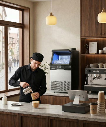 专业商业空间产品摄影,温馨复古风咖啡馆吧台场景,背景为浅米色纹理墙面与胡桃木橱柜,左侧木框大窗透出欧洲小镇街景,悬挂暖黄球形吊灯。画面中心是浅灰纹理大理石吧台,一位身着黑色制服、戴黑帽的白人男咖啡师正用银色拉花缸向透明杯中注入奶泡,姿态专注。右侧立着一台银黑配色商用制冰机,透明视窗内盛满冰块,机身带数字显示屏与散热格栅,旁侧摆放银黑意式咖啡机、收银机与堆叠的牛皮纸咖啡杯。暖光氛围灯与自然光交织,色