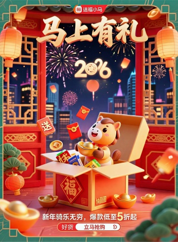 国潮风与软3D结合,拟人小马萌趣送礼,鎏金元素点缀,喜庆卡通感十足,春节氛围拉满。