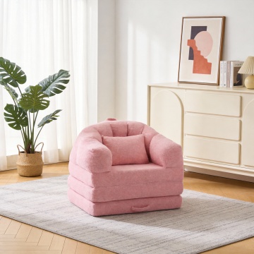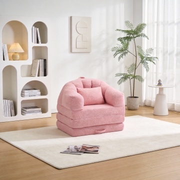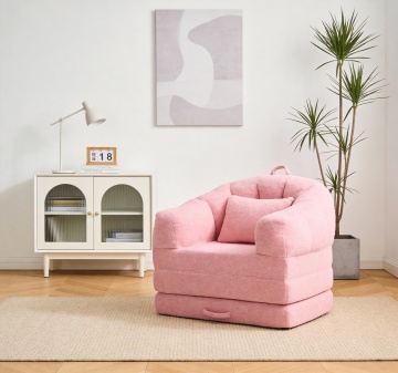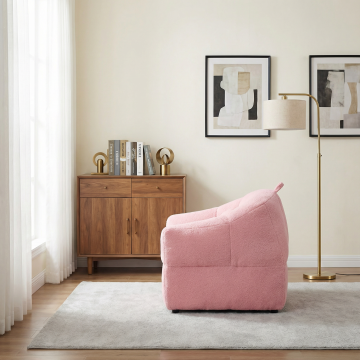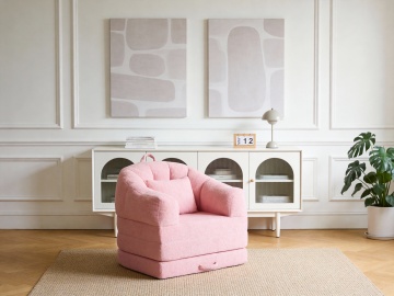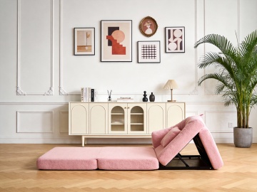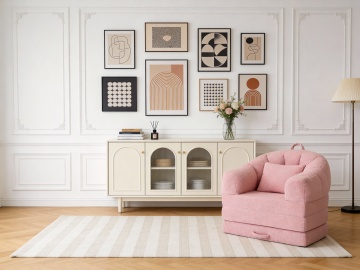 主体沙发床:一张/浅粉色的单人沙发,采用柔软的泰迪绒面料。 空间与布局: 现代简约风格的客厅,整体色调温暖柔和。 背景是一面白色的法式墙,墙上挂着一组现代艺术装饰画,包含不同尺寸和风格的抽象与几何图案。地上铺着原木色的地板搭配米白色的地毯(有图案),墙前放置一个米白色的餐边柜 / 储物柜,柜面上陈列着书籍、香薰、台灯等摆件。 右侧角落有一盆大型绿植(散尾葵,种植在编织盆里),增添生机。