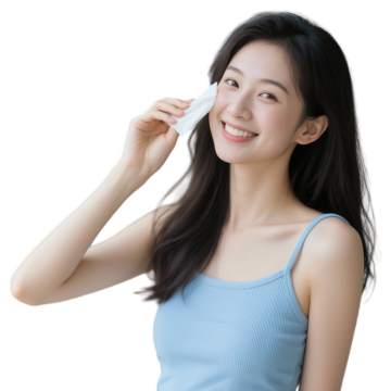 一张以女性面部为特写的美妆护肤主题照片,采用柔和的自然光从上方和侧面均匀照射,营造出明亮、纯净、温暖的氛围。画面中,一位年轻女性闭着双眼,嘴角微微上扬,露出恬静愉悦的微笑,双手轻轻捧起脸颊,姿态自然放松。她的皮肤呈现出极致的清透感、水润光泽和健康的粉嫩色调,肌肤表面仿佛覆盖着一层薄薄的精华液或保湿霜,反射出细腻的光泽,毛孔细腻几乎不可见,质感光滑柔嫩,充满弹性。深棕色的长发柔软地垂落在脸颊两侧,发丝轻盈飘逸,部分细碎的发丝自然散落,增添了画面的灵动与真实感。整体色彩以柔和的米白色为背景,衬托出肌肤的白皙与粉嫩,色调统一和谐,光影过渡自然,高光区域集中在额头、鼻梁、颧骨和下巴等面部高点,阴影柔和地勾勒出脸部的立体轮廓。照片的视觉焦点完全集中在女性完美无瑕的肌肤和愉悦的表情上,构图简洁大方,以人物面部为中心,背景干净无杂物,突出展现皮肤的水润状态和健康美感,传递出舒适、放松、享受护肤过程的情感,具有高度的视觉吸引力和信息传达效率,符合美妆护肤产品目标受众对理想肌肤状态的审美追求。