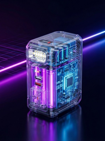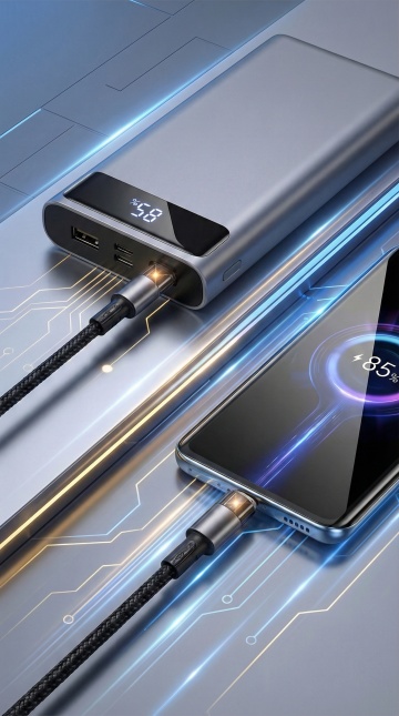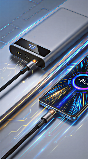 赛博朋克风格的智能手机充电场景,霓虹蓝与紫色渐变光效笼罩,手机屏幕显示动态赛博数据流图案,充电器和数据线呈现金属质感与霓虹灯带装饰,白色桌面转化为带有电路纹理的黑色高科技平台,背景墙变为布满全息投影广告和管线的未来都市夜景,整体光影对比强烈,充满未来科技感与机械美学,高细节,8K渲染,电影级构图