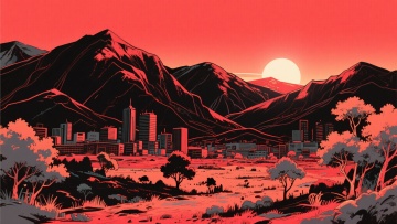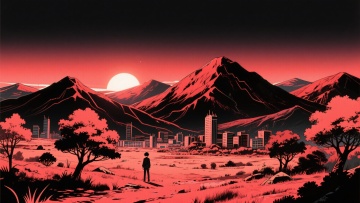 二次元写实,黑红色,城市,荒野,树,16:9,不要人物,细节丰富,生成2张
