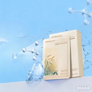 主体是 面膜包装盒。产品盒被放置在浅灰色的纯色背景上,旁边搭配了白色的盘子与折叠纸品作为装饰,整体画面干净柔和,突出了护肤产品的清新、简约质感。