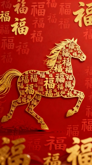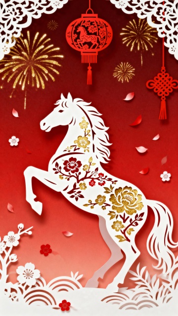 视觉细节:画面为红色祥云暗纹背景,中心是 3D 立体效果的红金剪纸小马(红色剪纸主体,鎏金描边,有轻微的立体阴影,仿佛浮于画面),小马周围环绕立体剪纸的小灯笼、福袋、祥云,画面下方是立体剪纸字体 “马年大吉 阖家幸福”,整体是中式剪纸风格,又有现代 3D 立体质感,年味十足且不陈旧。