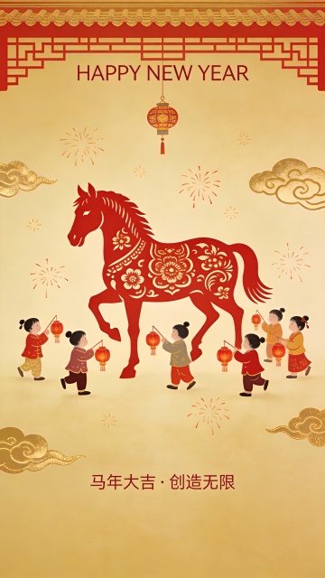 详细提示词:2026 马年祝福封面,中式立体剪纸风格,红金传统主色调,红色祥云暗纹背景,画面中心 3D 立体红金剪纸小马,红色主体鎏金描边,带立体阴影,周围环绕立体剪纸灯笼、福袋、祥云,下方立体剪纸字体 “马年大吉 阖家幸福”,中式剪纸纹理,现代 3D 立体质感,构图饱满对称,8K 超清,传统新潮年味,适合全家通用祝福封面。