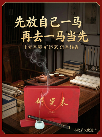 特写镜头,在一片被薄雾笼罩的千年古茶园深处,一座青瓦白墙的徽派茶寮半隐半现,茶寮前的青石平台上,一个雕刻着云纹的深棕色紫砂礼盒静静卧在铺着艾草的竹编垫上,礼盒正面烫金"中秋茗礼"四字与水墨绘制的茶树山峦相映成趣,礼盒旁的粗陶茶盘上,三只素雅的白瓷茶杯呈品字形排列,杯中漂浮着金黄的桂花乌龙茶叶,茶盘边缘点缀着饱满的板栗与几粒鲜红的枸杞,背景是朦胧的远山和几枝斜逸的金桂,空气中弥漫着茶叶与桂花的复合香气,色调以墨绿、赭石与鎏金为主,营造出清贵雅致的中秋品茗意境。