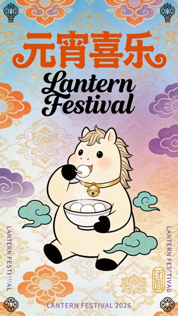 画面顶部横向排列书法笔触 + 几何切割艺术字体的玫红色中文 “回门拜年”,字体笔画末端做圆润卷曲处理,下方配缠绕式艺术花体英文 “Visiting Day”,英文字母与中文笔画交织,构成视觉主标题;画面底部两侧各竖排一列微小的浅蓝色无衬线英文 “SECOND DAY 2026”,视觉中心右下角盖一枚极简线条的浅金色 “拜年” 印章。画面核心主体是驮着礼品、尾巴欢快摇摆的奶咖色 Q 版卡通小马,它戴着粉色蝴蝶结头饰,背上背着装满糕点的竹篮,正迈步向前;竹篮周围环绕 3 个扁平化白色线条祥云,画面四角各点缀 1 个迷你粉色花朵符号。背景是奶白到淡蓝的柔和渐变,整体采用对称式居中布局,上下留白突出走亲访友场景。