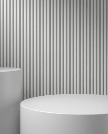 极简主义室内场景,左侧保留垂直条纹木质装饰墙元素,右侧为平滑米白色主墙面,前景有圆形白色桌面、浅色木质交叉腿圆桌,悬挂着白色与浅棕色条纹球形吊灯,地面是光滑大理石瓷砖,右下角有浅灰色地毯一角。背景改为柔和渐变的浅灰蓝与米白过渡色调,光影调整为从右上角窗户斜射而入的午后温暖阳光,在墙面和地面形成清晰的长条形光影斑驳效果,整体保持3D渲染的细腻质感、干净利落的线条和简约自然的现代设计风格,色调以原木色、米白色、浅灰色为主,营造宁静舒适且明亮通透的氛围。