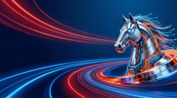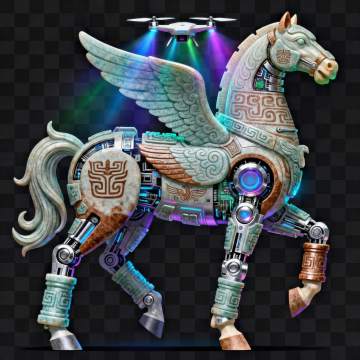 赛博朋克风机械马,融合国潮元素与霓虹电路,金属质感与虚拟自然交织,梦幻酷炫,未来感十足,祥云环绕,寓意新春福运。