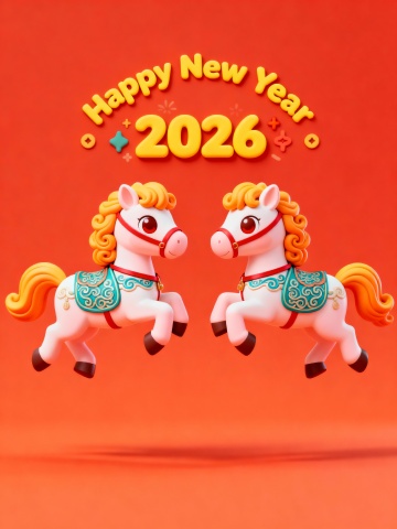 软3D风卡通小马跃动,鎏金“2026”闪耀,粒子光效迸发喜庆感,红紫渐变背景搭配金币元素,传递新年暴富暴美暴瘦的可爱祝福。