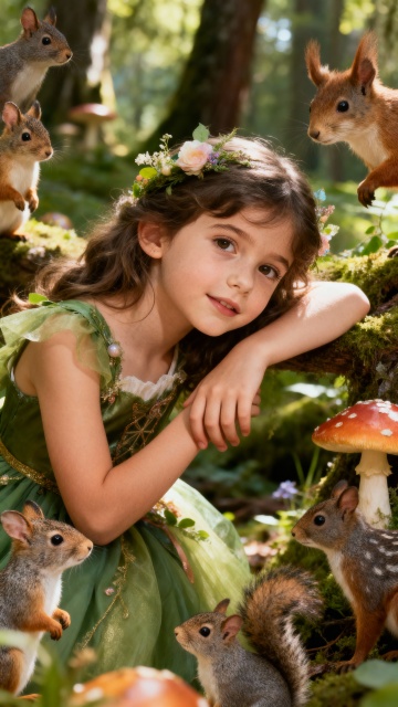梦幻插画风,超现实主义虚拟自然,水彩质感,少女与森林精灵共舞,光影交织。