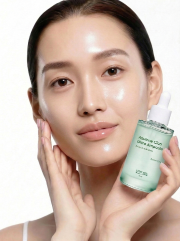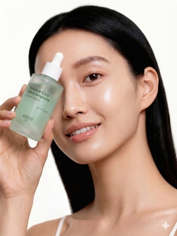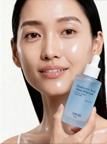 美妆产品宣传海报,整体采用清新通透的蓝白渐变色调,柔和的顶部光源营造出水润光泽感,3D立体展示的白色软管状护肤品置于圆形白色平台上,周围点缀白色花朵和绿色叶片,画面上方有产品核心功效的蓝色圆形图标与文字说明,中部包含分点介绍的肌肤问题示意图与解决方案,下方通过水滴、透明气泡等元素展现产品水润质地,搭配清晰易读的无衬线字体,整体排版层次分明,信息传达高效,符合护肤品针对敏感肌、追求温和清洁与保湿人群的宣传目的,保持相同设计风格与视觉元素,替换展示不同护肤品。