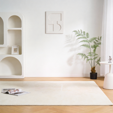 现代极简风格的客厅场景,以浅灰色调为主的现代家具布置,画面聚焦于铺在浅灰色瓷砖地面上的浅灰色条纹地毯特写,地毯表面有细腻的竖条纹纹理和柔软的编织质感,占据画面下方大部分区域;背景中可见浅灰色布艺沙发,搭配几个同色系的靠垫,沙发旁有一个圆形金属边框的小茶几,靠墙处有一个简约的灰色搁板,上面放置一个小型装饰画框;右侧是大面积的落地窗,透过轻薄的白色纱帘洒入明亮柔和的自然光,光线在地毯和地面上形成自然的光影过渡,窗外可见模糊的绿色植物,整体营造出宁静、整洁、高级的现代家居氛围,空间感开阔,线条简洁,色彩统一和谐,具有清晰的视觉层次和舒适的居住感。