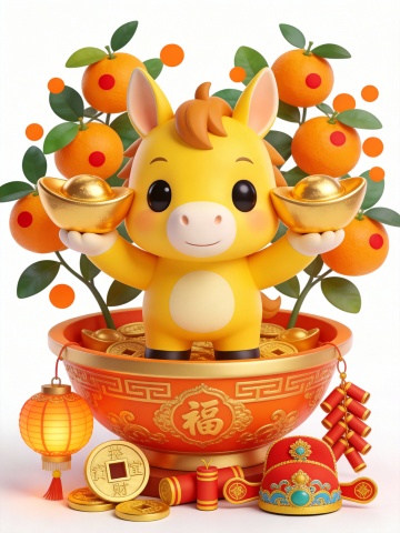 6、橘红色描金聚宝盆承载的新春场景,小马两只前蹄举着一个沉甸甸的大金元宝,耳朵竖得笔直,它身后簇拥着叶片带橘红色波点的风格化年桔,聚宝盆底座下摆放着招财进宝主题灯笼、方孔铜钱、炮竹与一顶精致的财神帽。