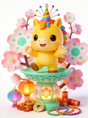 8、薄荷绿色雕花花灯盏承载的新春场景,小马头顶戴着一个彩色的人胜发饰,两只前蹄开心地拍着,它身后簇拥着花瓣带薄荷绿色波点的风格化桃花,花灯盏底座下摆放着缤纷花灯、方孔铜钱、炮竹与几缕五彩的编织彩绳。