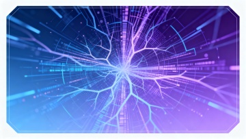 深蓝色背景下的赛博朋克风格3D渲染科技场景,画面顶部布满由0和1组成的二进制数字流,呈现出悬浮的粒子效果,中央有一道明亮的蓝色光束从上方垂直射下,照亮下方由蓝色发光线条构成的电路板纹理地面,地面上布满整齐排列的发光电路纹路和数字代码,整体光影效果具有强烈的纵深感和空间感,光线带有柔和的光晕和渐变,营造出神秘而充满未来感的科技氛围,色调以深蓝和亮蓝为主,色彩和谐统一,画面简洁大气,充满科技感和设计感。