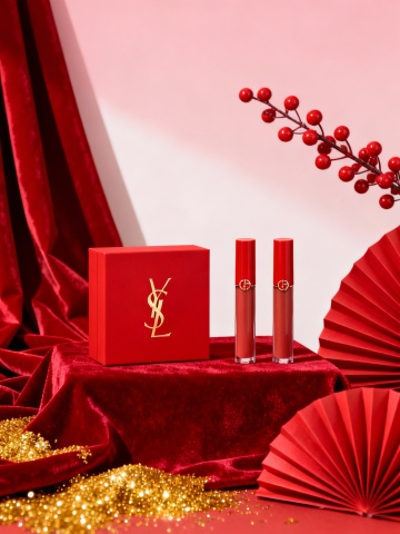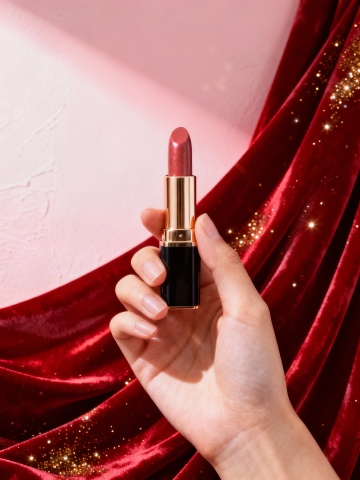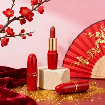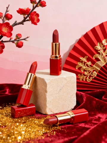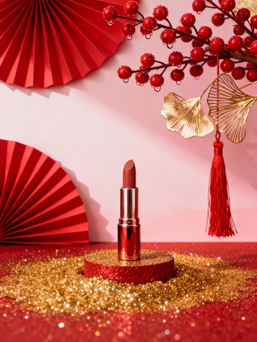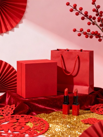 礼盒套装展示图 核心提示词:商业产品摄影,红色方形礼盒与红色手提袋置于红色丝绒布上,旁边摆放两支红管口红,背景为浅粉色渐变墙面,装饰红色纸扇、红色剪纸、金色闪粉和带红色浆果的枝条,整体氛围奢华喜庆,充满新春气息,8K超高清,写实风格。