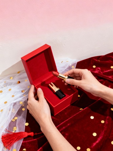3D重拟物风格,柔和粉调营造甜美舒适感,金属质感唇膏与塑料风礼盒交织,节日氛围浪漫精致。