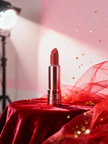 暖黄绸缎、蝴蝶结与柔和光影交融,搭配口红粉调、瓶身金棕,营造出优雅华贵又温暖的氛围,尽显美妆品精致感。