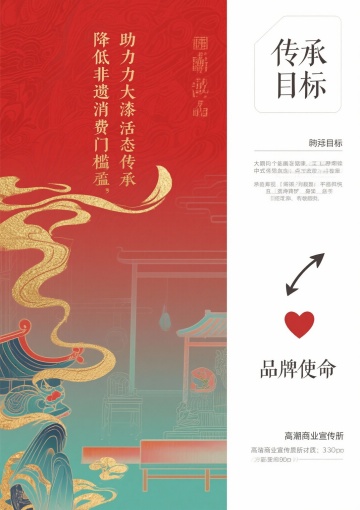 核心风格要求(所有页面通用前缀):国潮风,融合大漆非遗技艺元素(漆色、漆纹、漆工艺细节),现代简约审美,色彩以大漆经典色(朱红、乌黑、明黄、石青)为主,搭配低饱和辅助色,画面细腻有质感,版式干净留白合理,符合品牌年轻化定位,高清商业宣传册质感,300dpi,适合印刷第1页:封面提示词:国潮风品牌宣传册封面,主体展示“漆造”品牌Logo,Logo融入大漆髹涂纹理,背景为渐变朱红大漆底色,点缀细金漆线条勾勒的传统缠枝纹,右上角标注核心定位“千年大漆,玩转出圈”,右下角小字“非遗大漆年轻化品牌”,整体风格大气简约,视觉中心突出,无多余元素第2页:品牌引言·何为漆造提示词:国潮风宣传册内页,左侧大面积留白,用乌黑漆色书写标题“何为漆造”(书法字体),下方配小字“以漆为媒,连接传统与当下”;右侧分上下两个小版块,上方是浅米色背景搭配朱红漆线勾勒的大漆树简笔画,下方是简洁文字区域(文字内容占位符:“漆造,立足大漆非遗年轻化传播,打破技艺认知门槛,让千年漆艺走进当代生活”),画面左侧加1条细石青漆色竖线分割,整体雅致有呼吸感第3页:核心定位·千年大漆 玩转出圈提示词:国潮风宣传册内页,版式左右分栏,左侧朱红大漆底色,用金色字体突出核心定位“千年大漆,玩转出圈”,背景暗纹为大漆推光工艺的细腻光泽纹理;右侧浅灰色背景,上方是“定位解读”标题(石青漆色),下方用简洁图标+文字占位符呈现核心逻辑:“传统漆艺传承+潮流载体创新+情感互动体验”,每个逻辑点搭配简约漆艺元素图标(漆刷、潮流配饰、握手符号)第4页:非遗底蕴·大漆的千年传承提示词:国潮风宣传册内页,上方通栏展示大漆技艺历史场景简绘(低饱和度水墨风格,描绘古代工匠髹漆场景),下方分两栏,左栏标题“大漆非遗的文化内涵”(乌黑漆色),配朱红漆色细边框;右栏标题“千年技艺的当代价值”(乌黑漆色),同样配朱红漆色细边框,两栏均预留文字占位符区域,背景点缀细微漆粉质感纹理第5页:品牌Logo设计解析提示词:国潮风宣传册内页,左侧主体展示“漆造”Logo完整图形,Logo采用朱红与乌黑撞色,融入大漆缠枝纹与“漆”字意象,右侧分三个小版块,分别标注“色彩寓意”“纹样灵感”“字体设计”,每个版块搭配对应简约图标(调色盘、缠枝纹、字体符号),背景为浅米色,所有分割线采用石青漆色,突出设计细节第6页:品牌IP形象·漆小匠提示词:国潮风宣传册内页,左侧大面积展示IP形象“漆小匠”全身图(卡通形象,身着融合漆艺元素的潮流服饰,手持漆刷,面带微笑,形象活泼可爱),右侧展示IP三个不同动作表情(挥手、举产品、讲解漆艺),下方标注IP形象定位“漆艺文化传播小使者”,背景为浅灰色,点缀朱红漆色小圆圈装饰,整体风格童趣且不失国潮质感第7页:产品系列总览·漆造好物提示词:国潮风宣传册内页,上方通栏标题“漆造好物·三大产品系列”(朱红漆色书法字体),下方三栏均等分布,每栏展示一个产品系列的代表性产品缩略图(搭配简约文字标题:“生活美学系列”“潮流配饰系列”“文化纪念系列”),每个缩略图背景为乌黑漆色,点缀细金漆线条,整体版式规整,层次分明第8页:生活美学系列·漆韵日常提示词:国潮风宣传册内页,左侧展示3件生活美学系列产品(漆盘、漆杯、漆收纳盒),产品摆放错落有致,搭配简约绿植点缀,背景为浅米色,突出产品的大漆质感(推光光泽、纹理细节);右侧为文字区域,标题“漆韵日常”(石青漆色),下方预留产品介绍文字占位符,加朱红漆色细边框装饰第9页:生活美学系列·细节质感提示词:国潮风宣传册内页,采用多图拼接版式,展示生活美学系列产品的细节特写(漆盘的缠枝纹雕刻细节、漆杯的髹涂纹理、收纳盒的开合处工艺),每个特写图搭配简约文字标注(“缠枝纹雕刻”“多层髹涂”“手工打磨”),背景为乌黑漆色,用金色线条分割画面,突出大漆技艺的精湛细节,整体风格高端有质感第10页:潮流配饰系列·漆尚潮流提示词:国潮风宣传册内页,右侧展示4件潮流配饰系列产品(漆手镯、漆项链、漆发簪、漆钥匙扣),产品佩戴在模特手上/颈部(模特只露局部,突出产品),背景为朱红渐变漆色;左侧为文字区域,标题“漆尚潮流”(乌黑漆色),下方预留产品介绍文字占位符,搭配潮流元素图标(爱心、潮流符号),整体风格时尚动感第11页:潮流配饰系列·个性定制提示词:国潮风宣传册内页,左侧展示个性定制流程示意图(图标+文字:选款式→选漆色→加纹样→完成定制),背景为浅灰色,分割线用朱红漆色;右侧展示2件定制款配饰(刻有专属文字的漆手镯、定制纹样的漆项链),产品特写,背景为石青漆色,突出定制的独特性,整体版式清晰易懂第12页:文化纪念系列·漆承文脉提示词:国潮风宣传册内页,上方通栏展示文化纪念系列代表产品(漆制书签、漆制摆件、漆制礼盒),摆放在简约木质展示架上,背景为浅米色,点缀传统文化元素(竹简、印章);下方为文字区域,标题“漆承文脉”(朱红漆色书法字体),预留产品介绍文字占位符,整体风格庄重且有文化底蕴第13页:情感互动·漆艺体验活动提示词:国潮风宣传册内页,左侧展示漆艺体验活动场景简绘(多人参与手工髹漆,氛围轻松愉悦,低饱和度色彩),右侧分两个版块,上方标题“漆艺互动·传承有你”(石青漆色),下方列出2个核心体验活动(“手工漆杯制作工坊”“漆纹拓印体验”),每个活动搭配对应图标(