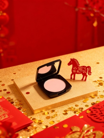 红金展台、马年剪纸与柔润金箔交融,搭配粉调腮红、黑亮粉盒,营造出喜庆华贵又精致的节日氛围