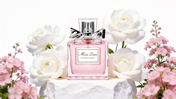 唯美感与浪漫感交织的3D重拟物风香水场景,玻璃瓶身透出柔和光影,玫瑰花瓣环绕,营造清新优雅的实景氛围。