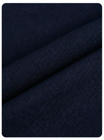 高分辨率特写摄影,展示一块深蓝色的柔软面料,呈现出细腻的斜纹肌理和紧密的纺织结构,面料被精心地以螺旋状褶皱的形态堆叠,形成自然流畅的波浪曲线,柔和的漫射光源从上方均匀照射,在褶皱处形成微妙的光影过渡,凸显出面料光滑而略带哑光的质感,整体画面呈现出织物特有的垂坠感与柔韧性,色调统一且纯净,无任何杂质或图案,仅聚焦于面料本身的材质美感。