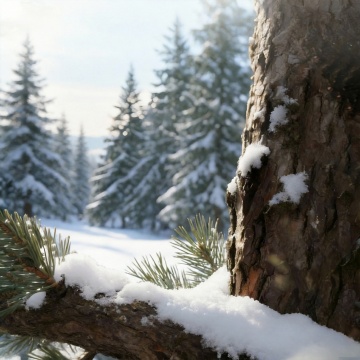 超写实风格的冬季雪景特写,纯净的白色积雪覆盖大地,呈现出细腻的纹理和自然的波浪起伏,远处是朦胧的雪山轮廓,天空为明亮的浅蓝色并带有柔和的光线效果,画面中飘着轻盈的雪花,近处的雪地上点缀着被雪覆盖的城市建筑屋顶和尖顶轮廓,整体营造出宁静而梦幻的冬日城市氛围,光线柔和,色彩以蓝白为主色调,保持高度的真实感和细腻的质感表现。