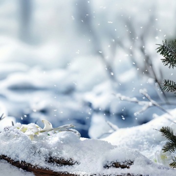 3D渲染风格的山水雪景海报,整体采用纯净的浅蓝色调,柔和的光线从上方照射,营造出宁静清冷的氛围。画面中,连绵起伏的山峦被设计成流畅的波浪形态,表面覆盖着半透明的冰层,冰层下可见细密的纹理,如同冰冻的湖面。山峰呈现出渐变的蓝白色,边缘有细腻的高光,增强了立体感和冰雪的质感。空中点缀着大小不一、形态各异的雪花,有的轻盈飘落,有的静静悬浮,雪花的棱角清晰可见,晶莹剔透。构图上,山峦从画面底部向上延伸,形成自然的视觉引导线,背景是渐变的浅蓝色天空,没有多余的元素干扰,整体简洁而富有设计感,突出了雪花与自然山水的融合,传达出纯净、静谧的冬日意境。