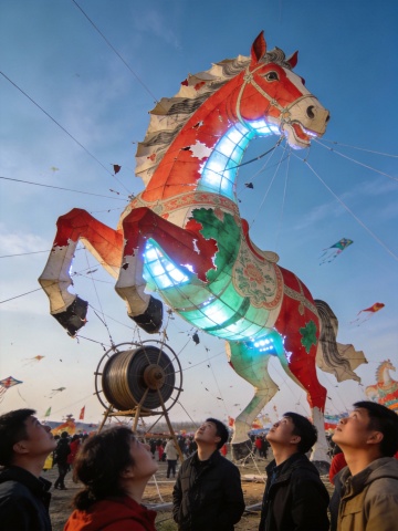 国潮风巨型充气马灯,融合中式纹样与霓虹光影,重拟物设计展现喜庆民族感,体积感十足,节日氛围浓厚。