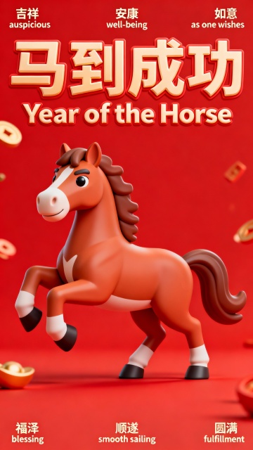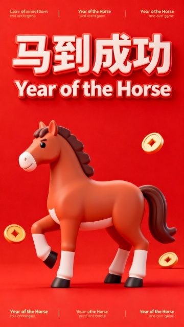 软3D风格卡通小马跃动于鎏金粒子环绕的喜庆红底,搭配“暴富”“暴瘦”等吉祥文字,营造出充满节日氛围的可爱视觉冲击。