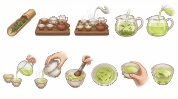 淡雅中国风插画风格,四个不同样式的青瓷茶杯,杯身分别饰有山水、花鸟、书法、缠枝莲纹样,温润通透的白瓷底色,青绿色调清新雅致,柔和的光影效果,杯内盛有淡绿色茶汤,杯口飘散着袅袅热气,周围点缀着新鲜的翠绿茶叶,叶片上带有晶莹的露珠,整体构图疏密有致,营造出宁静自然的茶文化氛围,线条细腻流畅,色彩过渡柔和,具有传统工笔画的细腻质感和现代插画的简洁美感,背景为纯白色。