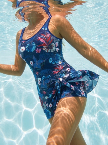 一张水下摄影照片,一位穿着黑色泳衣的女性运动员正在泳池中进行仰泳动作,她的身体呈水平仰卧姿态,双臂向后划水,双腿并拢上下交替打水,头部露出水面,周围水花四溅,清澈的蓝色水体中可见光线折射形成的波纹和泳池底部的瓷砖纹理,整体画面展现出游泳运动的动感与水下环境的宁静透明感,光影效果突出,水的质感真实,充满力量与速度的视觉冲击力。