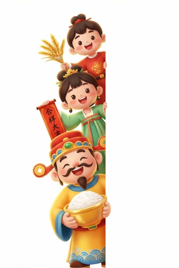 喜庆卡通插画风,国潮拟人财神倾金元宝,鎏金剪纸元素点缀,红梅灯笼映衬,福字高悬,春节氛围浓郁。