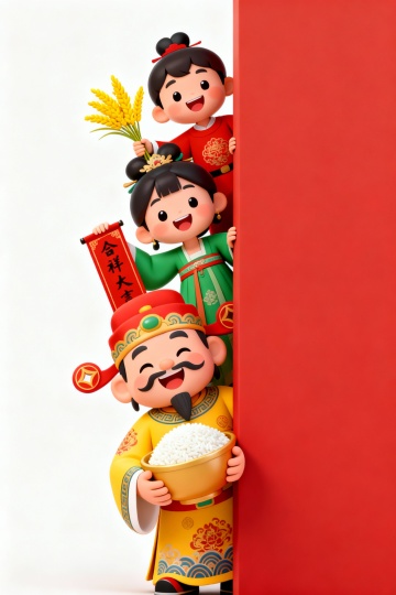 复古新春,国潮风剪纸财神手持金元宝,搭配撕纸拼贴与鎏金元素,红底衬托喜庆感,传统纹样点缀,寓意日富一日。