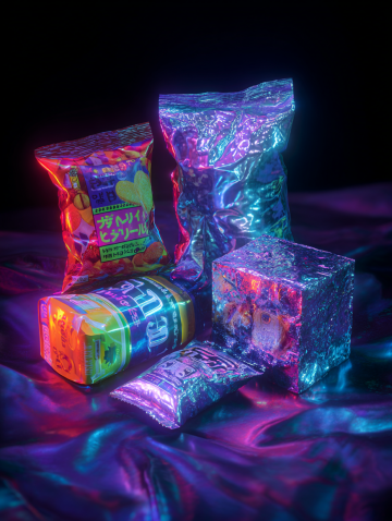 3D超现实风格,巨型薯片袋占据客厅,重拟物塑料质感,明亮色彩强化促销感,11.11大促主题突出。