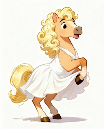 马丽莲梦露拟人风小马身着白色礼裙,金色卷发飘逸,水彩质感渲染梦幻唯美,卡通感十足,优雅可爱。