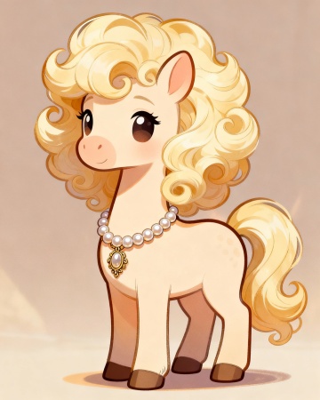 马丽莲梦露·可爱感与奢华感交织的拟人风小马,金卷发如云,佩戴珍珠项链,插画风格细腻梦幻,尽显优雅气质。