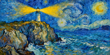 梦幻水彩插画,超现实主义风格,灯塔与书本交织,照亮知识的海洋。